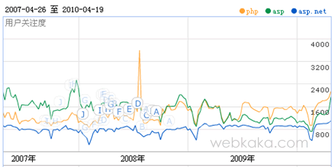 ????? 上圖為近3年的php,asp,asp.net用戶關(guān)注度比較,從圖中曲線圖看出,php在2008年下半年開(kāi)始受更多用戶關(guān)注,從2008年下半年到 2009年上半年,php與asp不分上下,受關(guān)注程度幾乎是一樣,而從2009年下半年開(kāi)始,php受用戶關(guān)注度已經(jīng)明顯超過(guò)了asp,而 asp.net的用戶關(guān)注度僅僅為php的1/2。