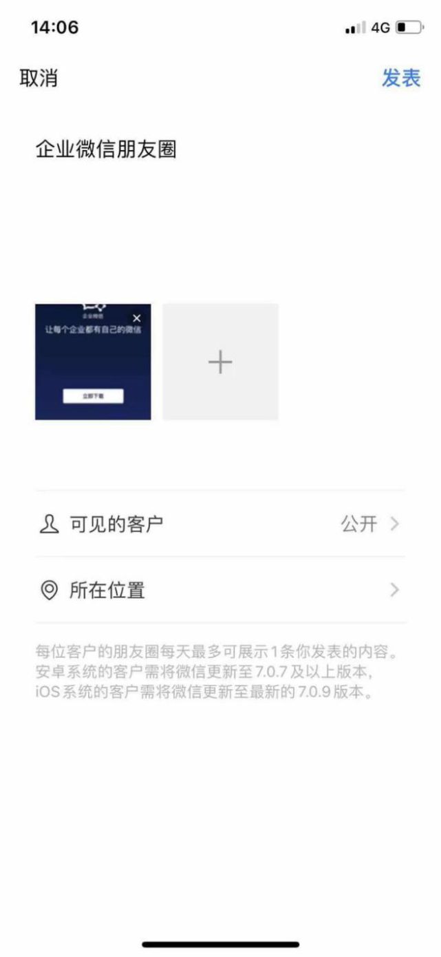 客戶朋友圈申請(qǐng)完成后,企業(yè)就需要發(fā)客戶朋友圈了,這個(gè)時(shí)候按照同樣的方法點(diǎn)擊客戶朋友圈就可以發(fā)了,企業(yè)微信朋友圈和個(gè)人微信朋友圈的頁面基本相似,并且也可以設(shè)置部分客戶群可見,并且發(fā)送的內(nèi)容也大同小異,既可以發(fā)送文字,也可以發(fā)送圖片,視頻等,只要會(huì)發(fā)個(gè)人朋友圈就可以輕松完成企業(yè)朋友圈的發(fā)布。