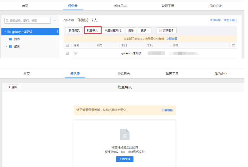 通訊錄-批量導入,下載批量導入模板,按照模板內指引填寫信息,并導入到指定部門。成功導入后選擇邀請會下發(fā)手機短信, 通知成員登錄郵箱。
