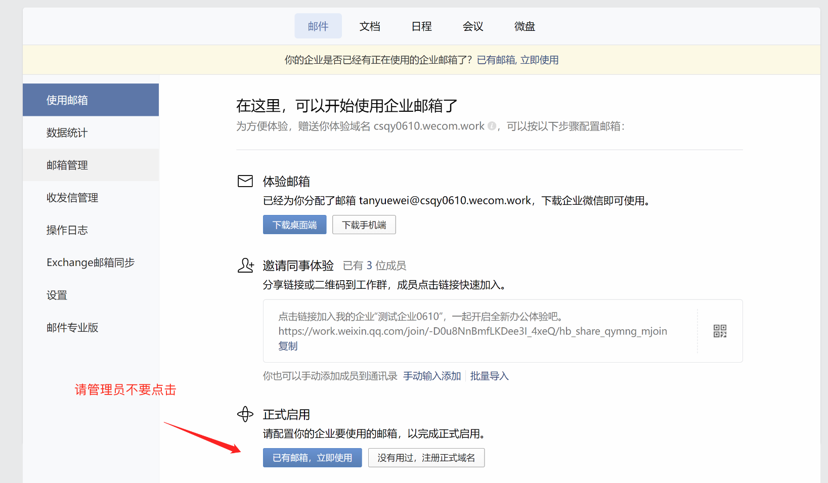 請(qǐng)管理員不要在以下頁(yè)面,進(jìn)行域名的綁定操作。這會(huì)導(dǎo)致原來的郵箱數(shù)據(jù)丟失。后續(xù)騰訊研發(fā)團(tuán)隊(duì)將會(huì)支持將企業(yè)郵箱整體遷移到企業(yè)微信,以替換體驗(yàn)域名。希望將郵箱和企業(yè)微信統(tǒng)一合并管理的企業(yè)可聯(lián)系我司銷售登記,后續(xù)排期升級(jí)。目前由于產(chǎn)品還在測(cè)試階段,不建議升級(jí)。